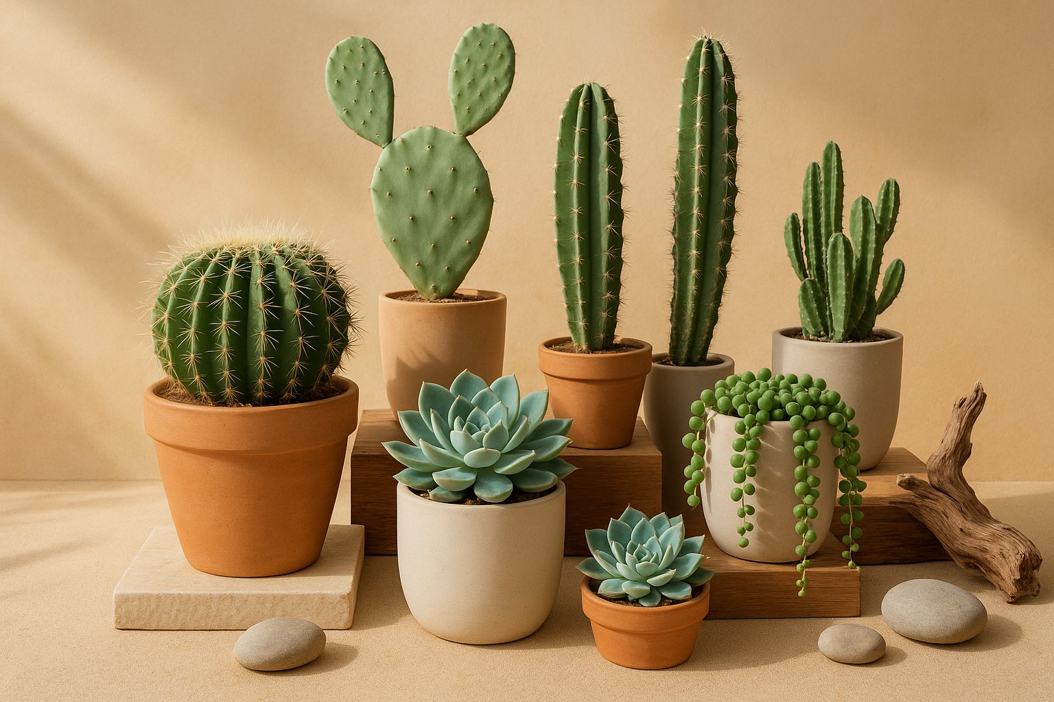 Neutral-toned planters—terracotta, gray, white—add understated elegance. Good lighting highlights the sculptural shapes of cacti and succulents after dark.